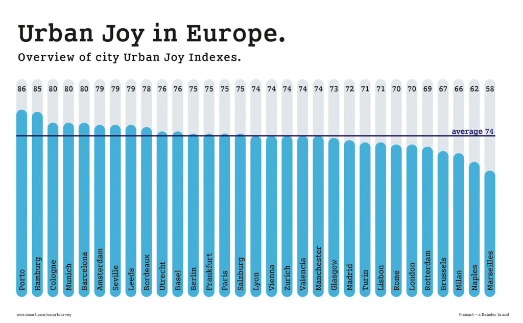 PORTO compte les habitants les plus satisfaits et les plus heureux. Ils attribuent à leur ville un URBAN JOY INDEX de 86 points. Plus de 94 % trouvent PORTO « très attractive ».